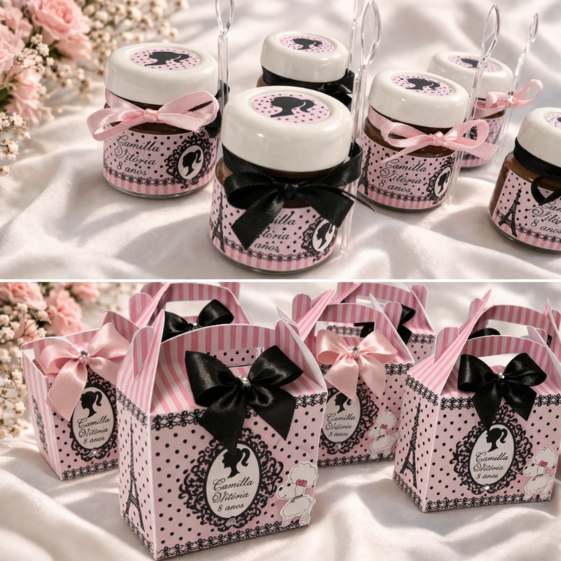 Eu faria um Kit para acompanhar po potinho de brigadeiro com uma garrafinha de água personalizada e um lencinho umidecido para as mãos.